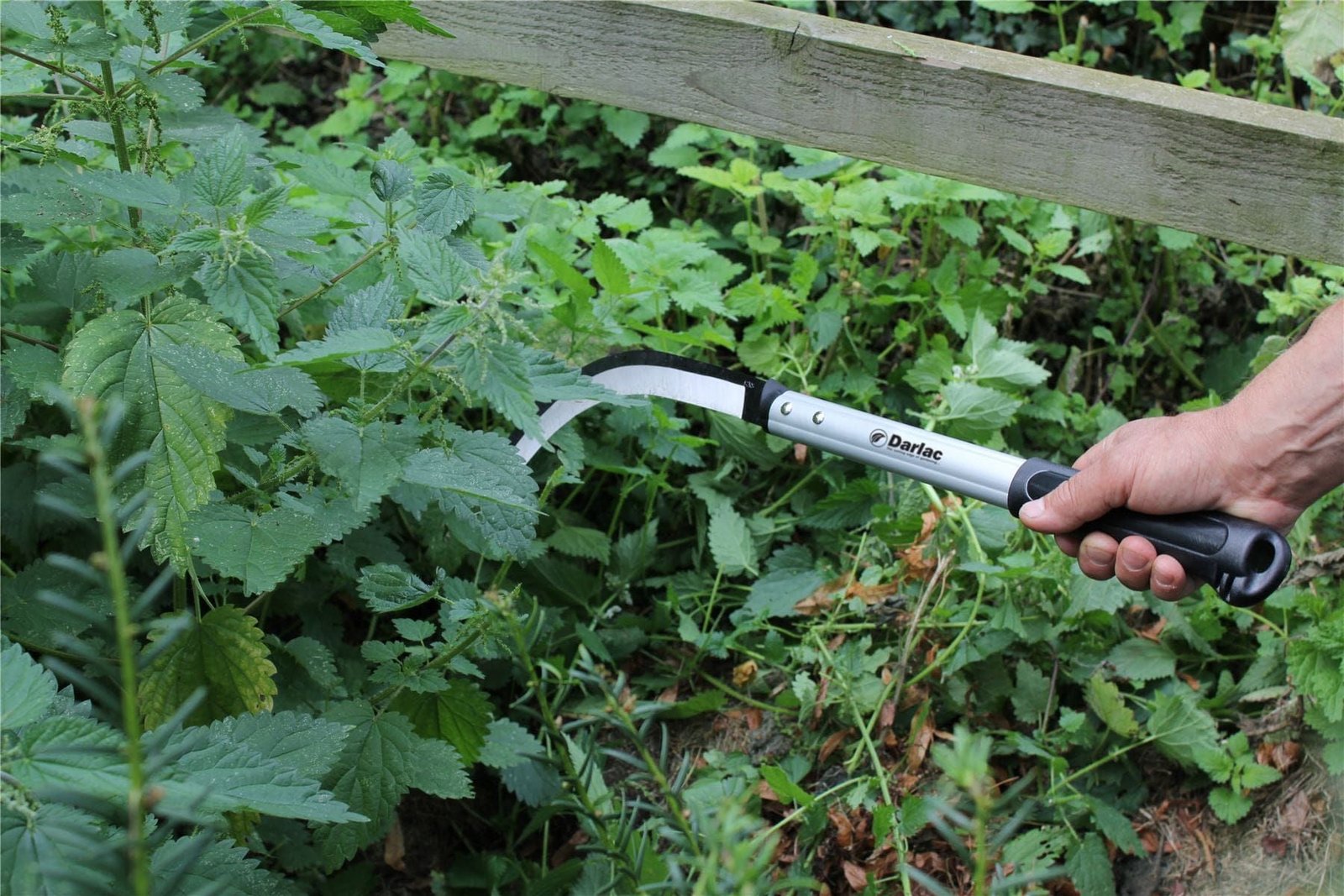 An aluminium handle with a solid rubber grip and a razor-sharp carbon steel blade which is resharpenable. With a slicing rather than hacking action pulling back on the handle at the end of a wring. For clearing nettles. thistles. briars, undergrowth and vegetation. USE EXTREME CARE when working with sharp objects. AN AWARD WINNER