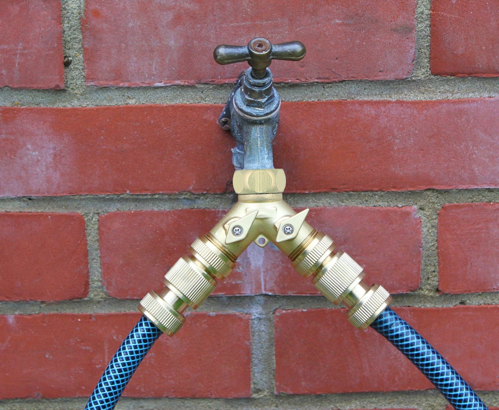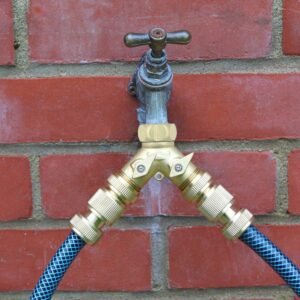 Solid brass Tap Manifold or Y connector. With screw direct to any 3/4 inch BSP tap providing 2 x 3/4 inch outlets Each outlet has an on/off tap which means you could fit one outlet to a timer / automatic water system and still use other to fill watering cans
