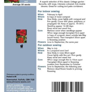 A superb selection of the classic cottage garden favourite with large intensely coloured fully double blooms. Great for cutting and patio containers. Sow from February to April, full details on packet.