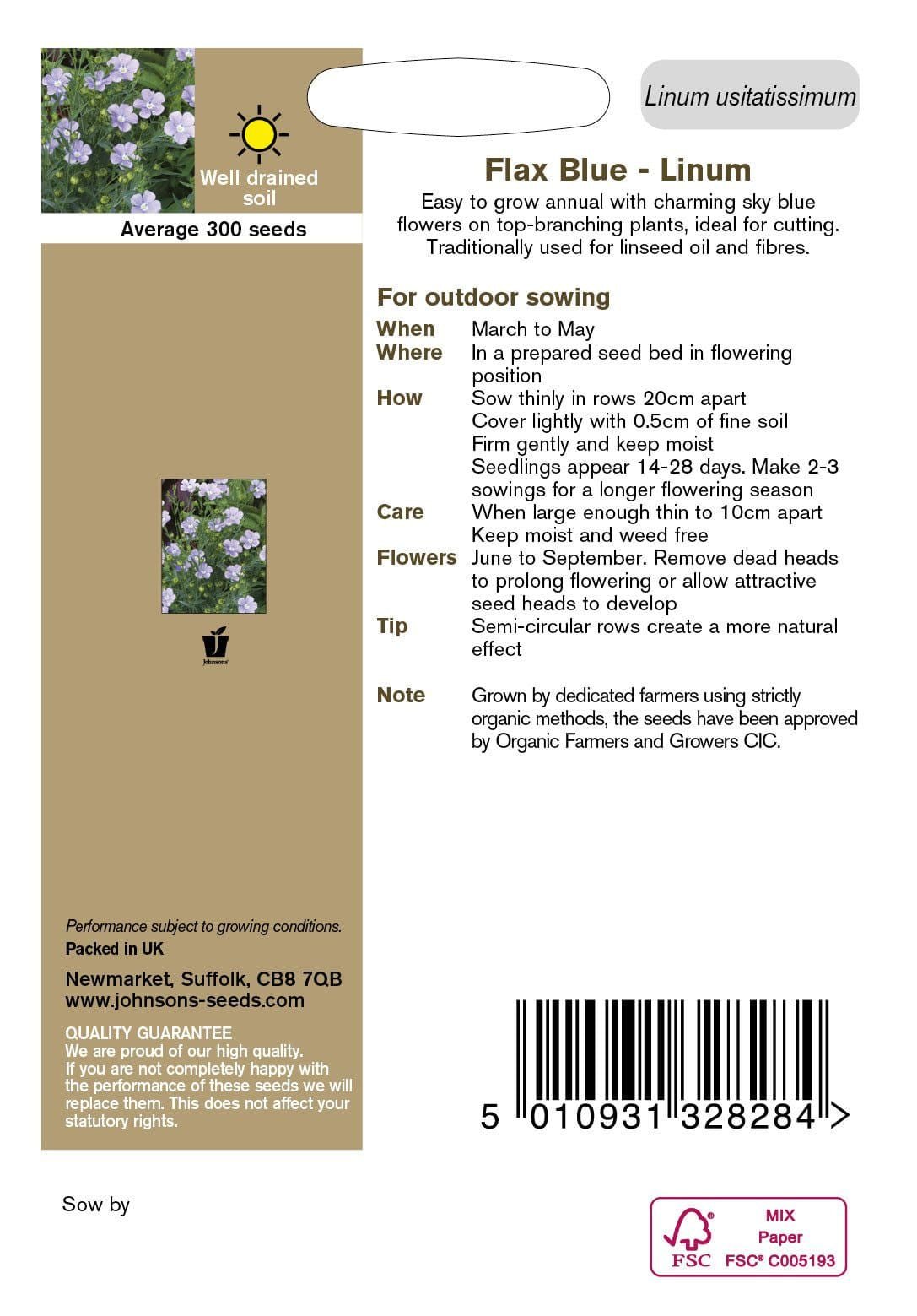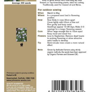 Easy to grow annual with charming sky blue flowers on top-branching plants, ideal for cutting. Traditionally used for linseed oil and fibres. Sow from March to May, full details on packet.
