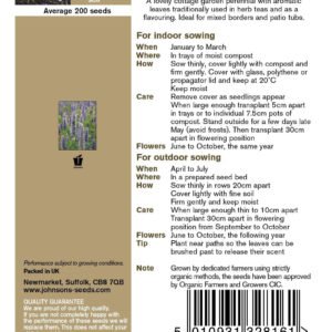 A lovely cottage garden perennial with aromatic leaves traditionally used in herb teas and as a flavouring. Ideal for mixed borders and patio tubs. Sow from January to March. Full details on packet.