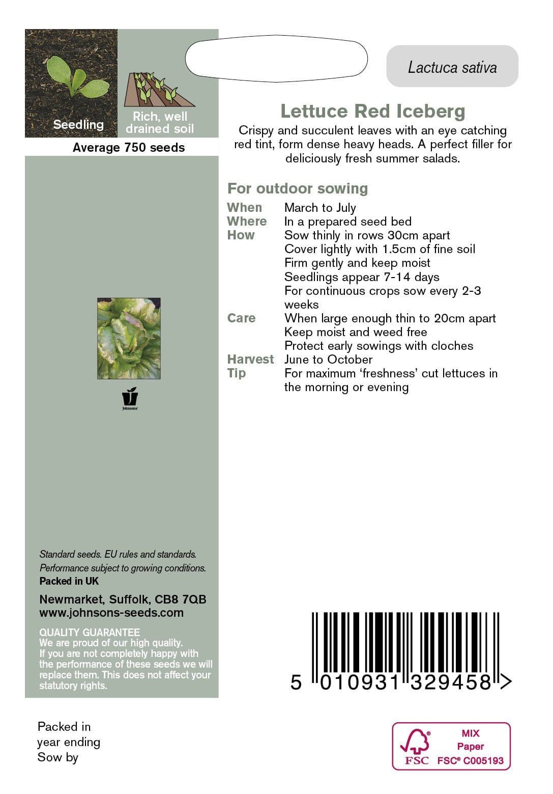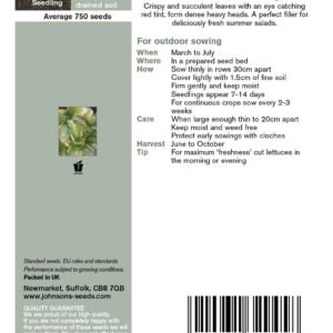 Crisp and succulent leaves with an eye-catching red tint form dense heavy head. A perfect filler for deliciously fresh summer salads. Sow from March to July. Full details on packet.