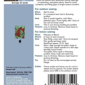 Deep red blooms with distinctive central markings on spreading, variegated plants. Ideal for mixed containers and filling gaps in bright summer borders. Height: 50cm Plant Class: Hardy Annual (HA).
