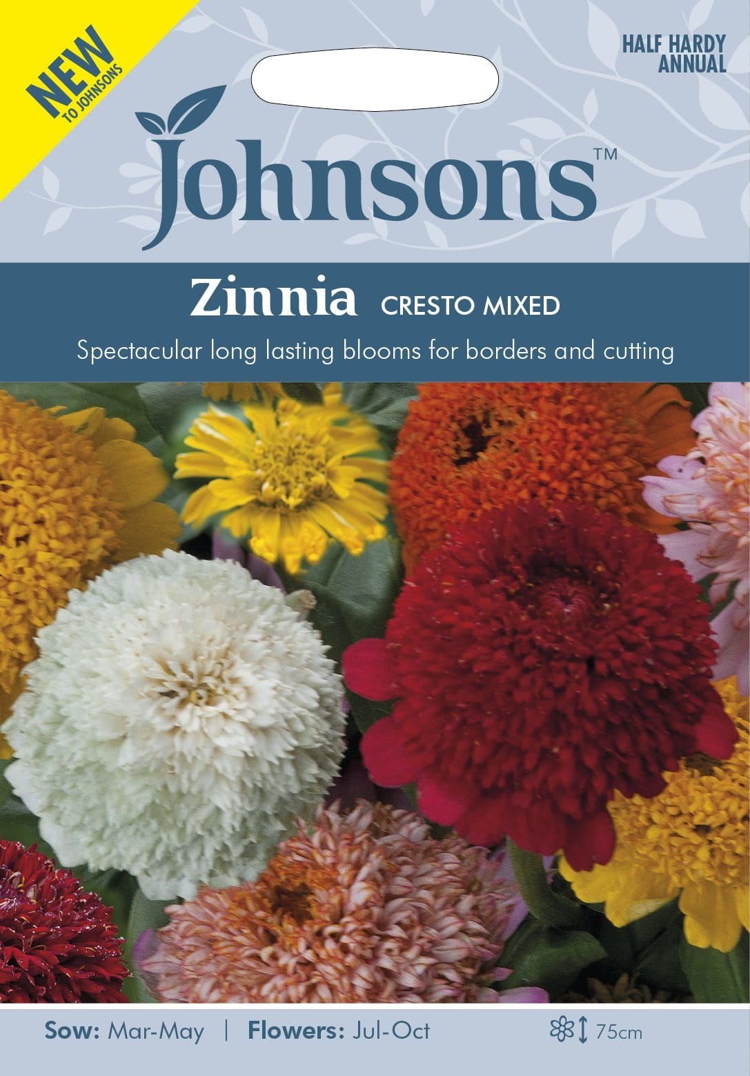Spectacular long lasting blooms for borders and cutting Eye-catching, crested ‘scabious flowered’ type with long lasting domed blooms on sturdy stems. Perfect for cutting and colourful summer borders.Height: 75cm Half Hardy Annual