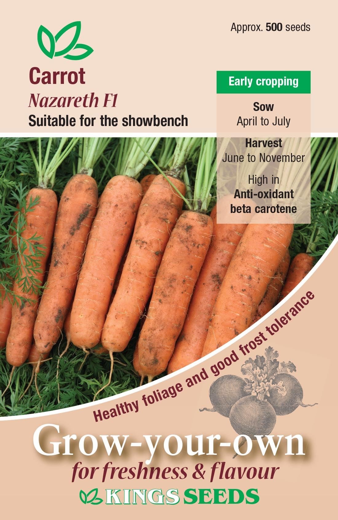 Kings Seeds – Vegetable – Carrot Nazareth F1 :- Mid Season maturity with outstandingly vigorous foliage. The smooth skin and appearance make this a possible contender for prizes on the Show bench. The rich orange roots are well buried in the soil, preventing green shoulders and gives roots good frost tolerance.