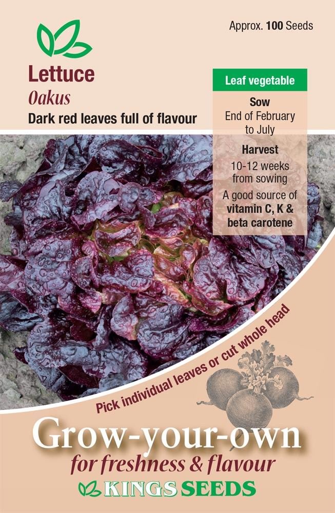 Kings Seeds – Vegetable – Lettuce Oakus :- Triple red oak leaf with very deep dark red, almost black leaves. Adds colour and flavour to salads.