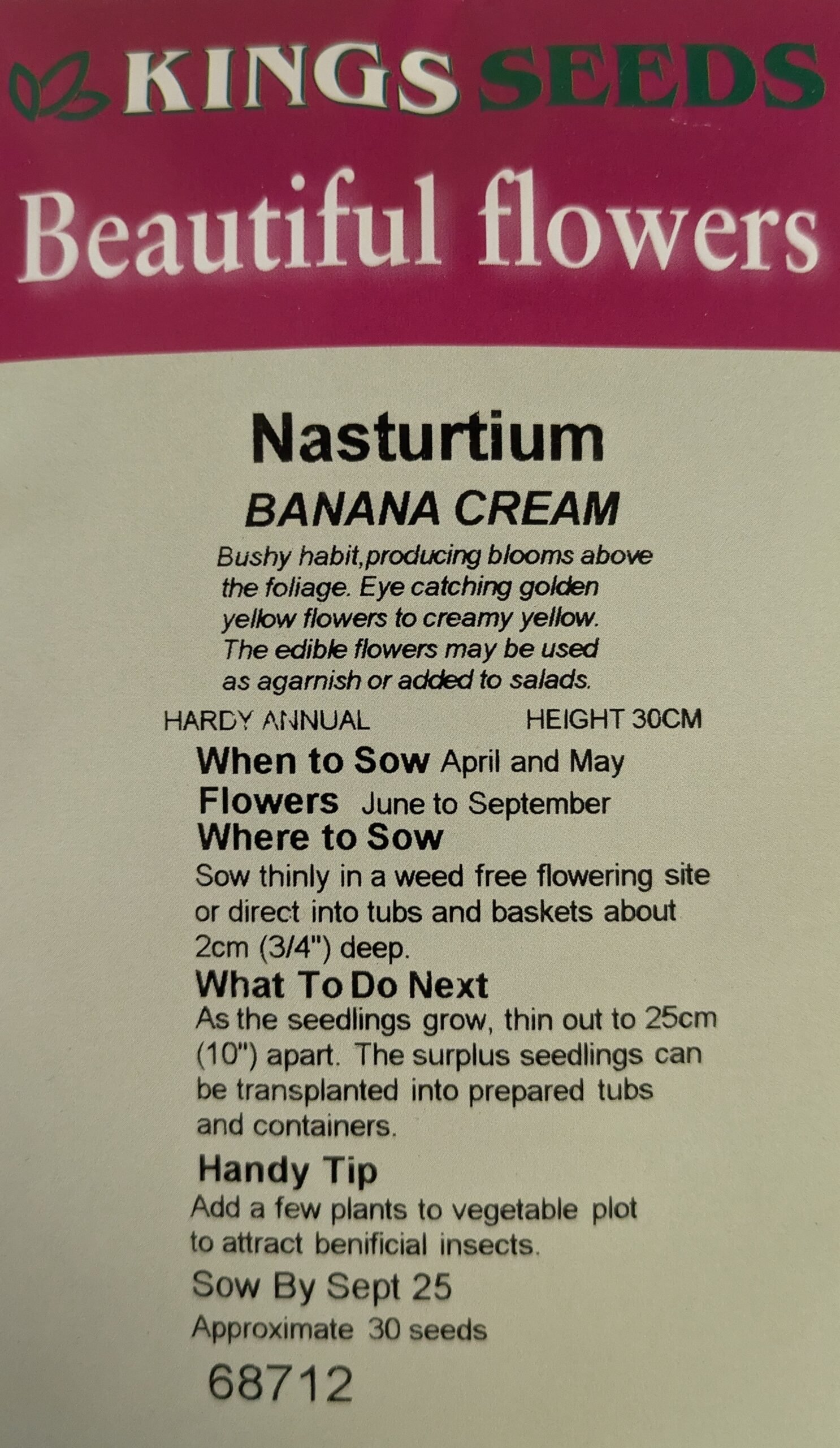 Bushy habit, producing all blooms about the foliage. Eye catching golden yellow flowers fading to creamy yellow. The edible flowers may be used as a garnish or added to salads. Height 25cm