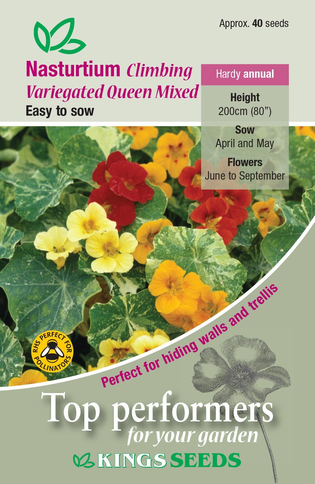 Attractive variegated foliage become clothed in a vibrant mix of single flowers. Ideal used for climbing a trellis, but can also be used as an effective ground cover, or cascading over the edge of baskets or containers.
