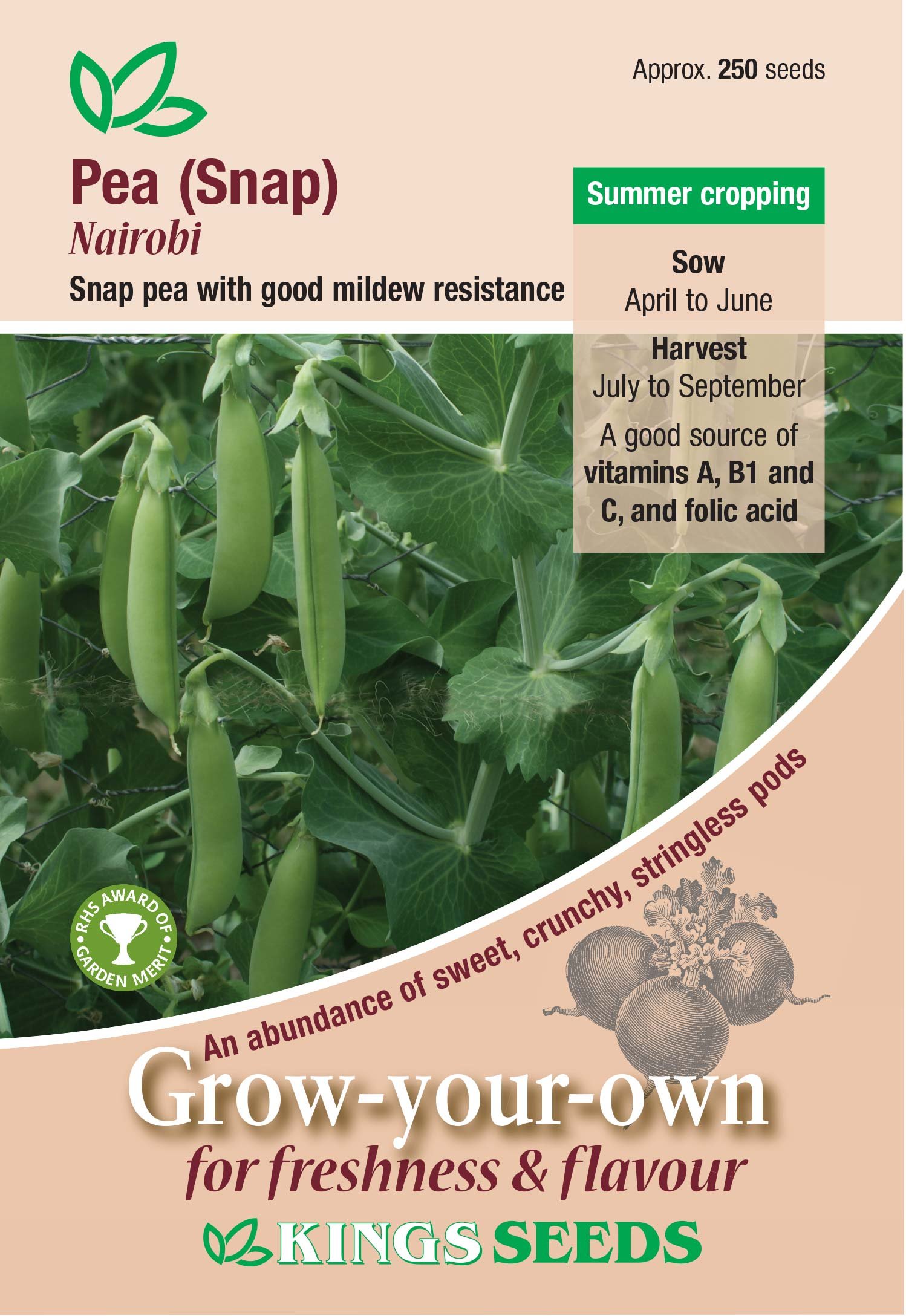 One of the best snap peas, with tasty, crunchy pods that remain totally stringless at picking stage.