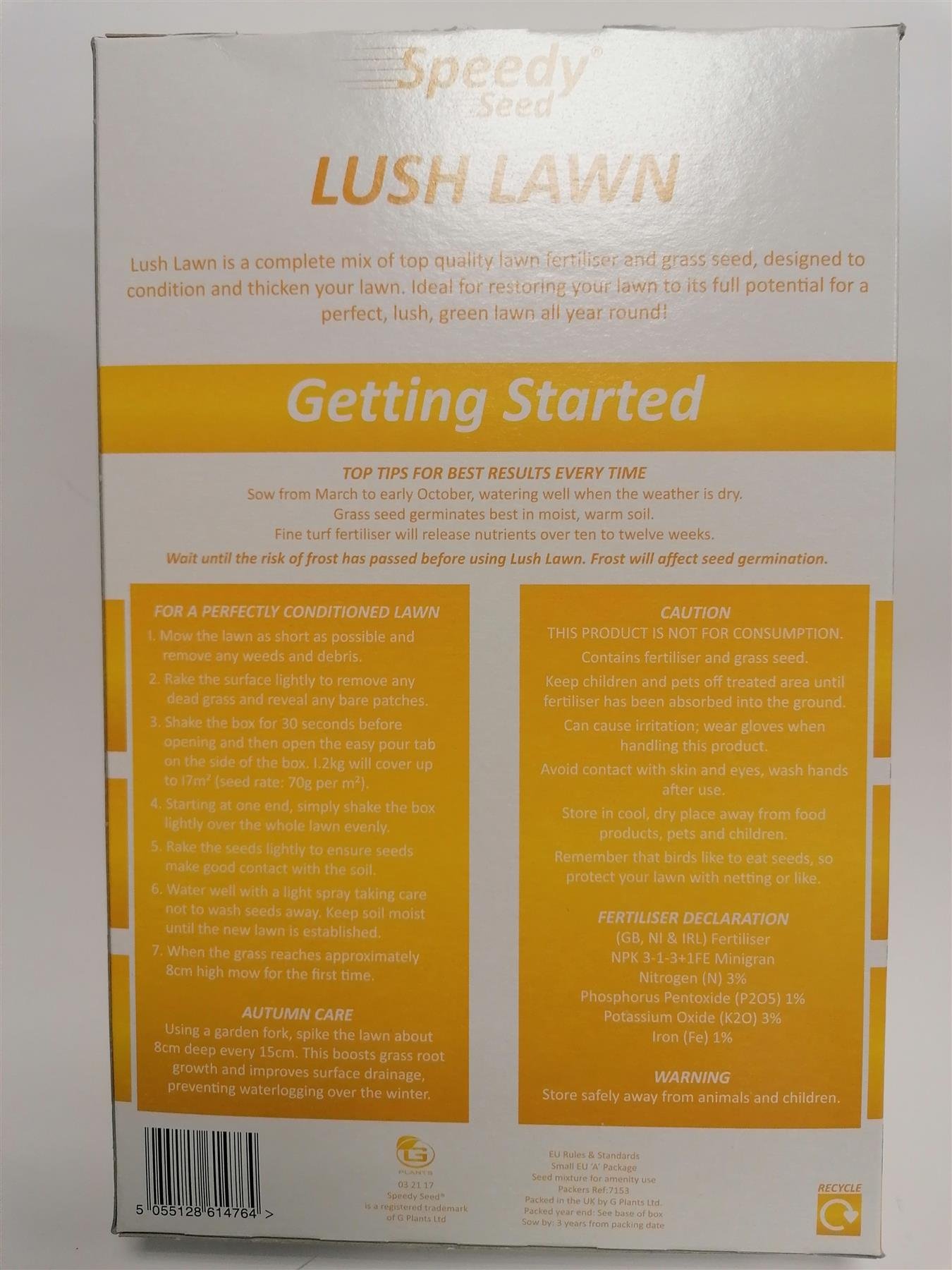 Lush lawn is a complete mix of top-quality lawn fertilizer and grass seed, designed to condition and thicken your lawn. 1.2kg Sow from March through to October.