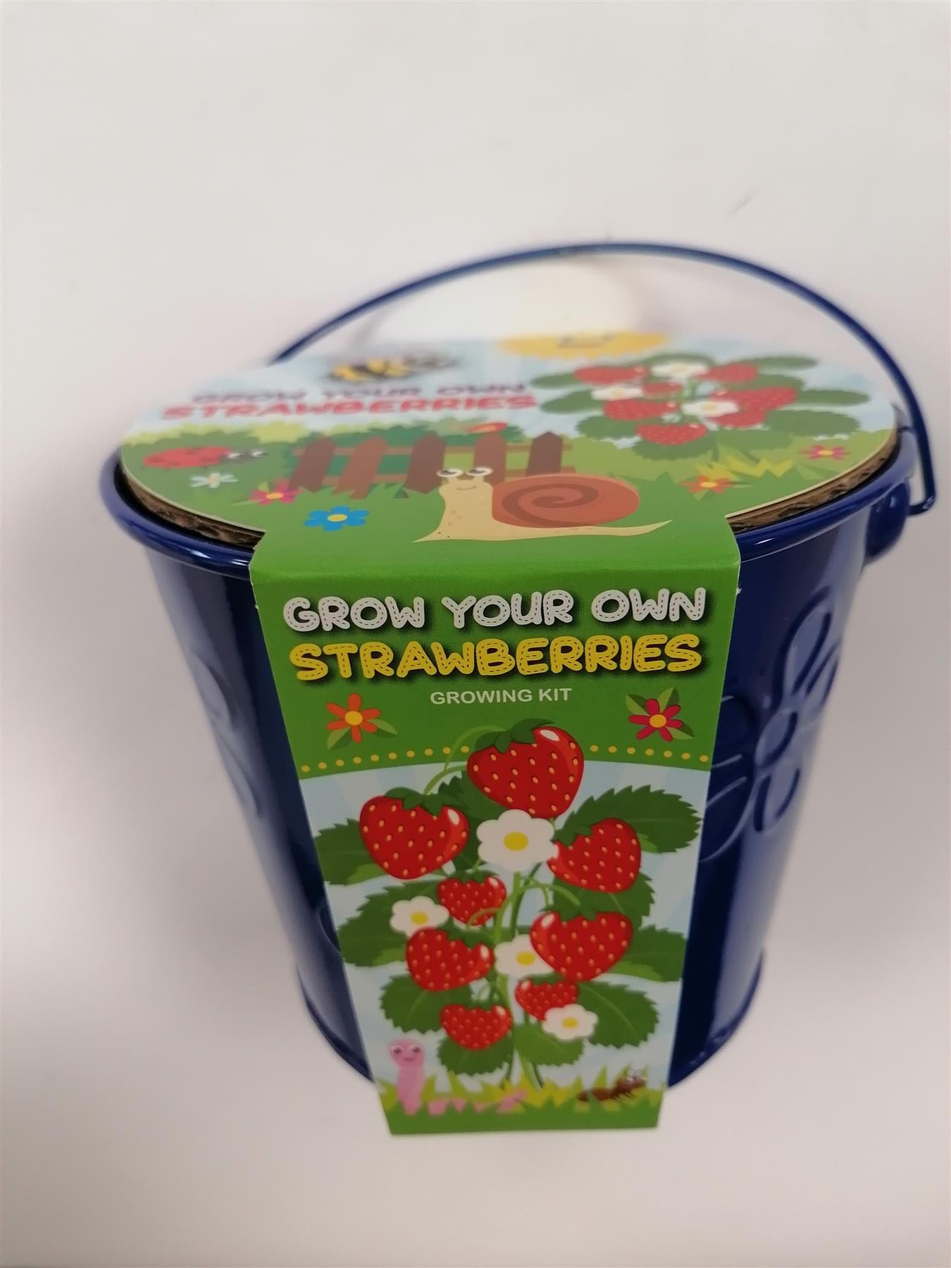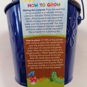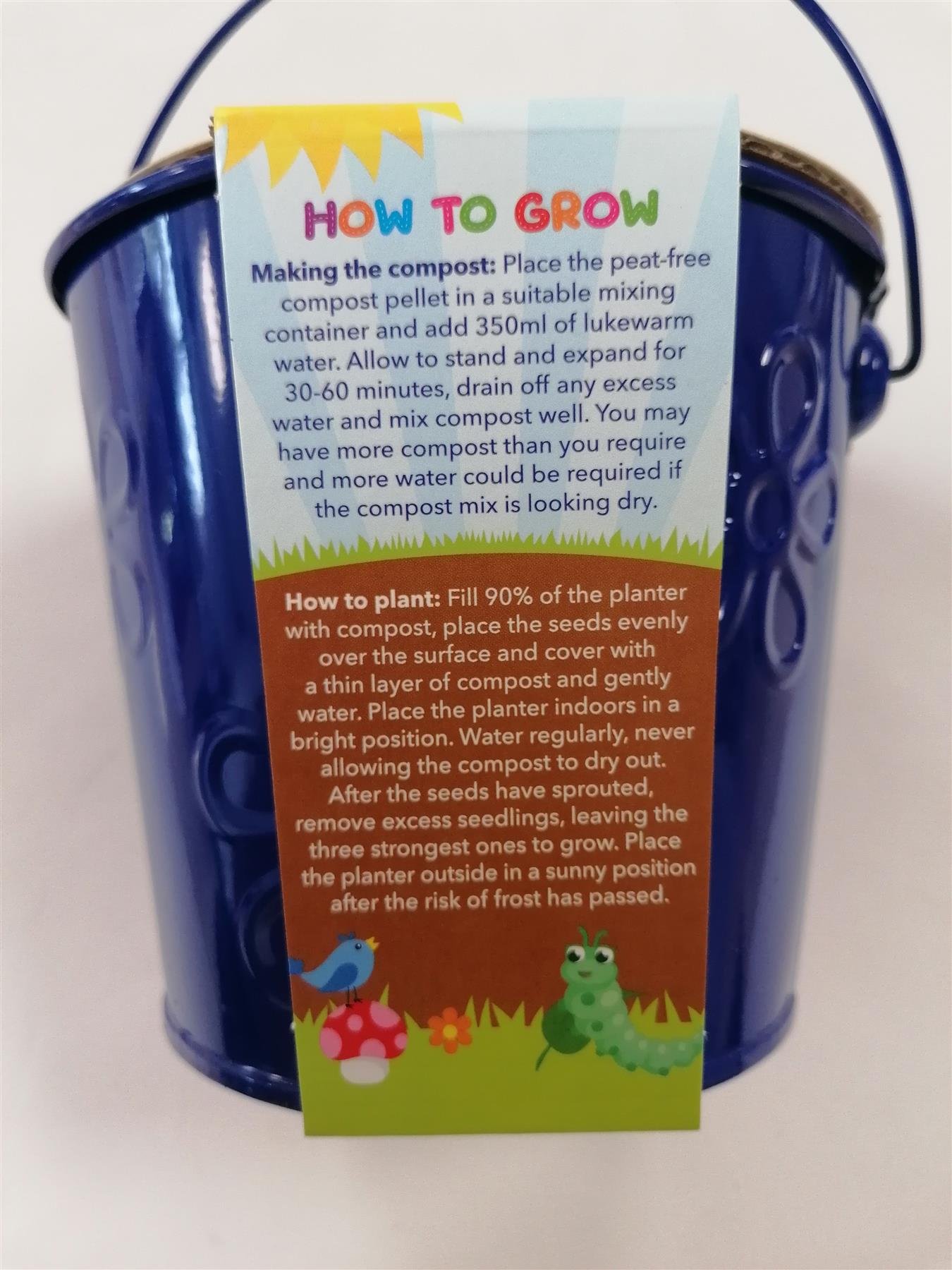 A blue bucket makes for a great gift and fun project. Teach children how to garden and grow their own fruit. Each kit includes a painted metal bucket, seed packet, peat free growing pellet, and growing instructions.