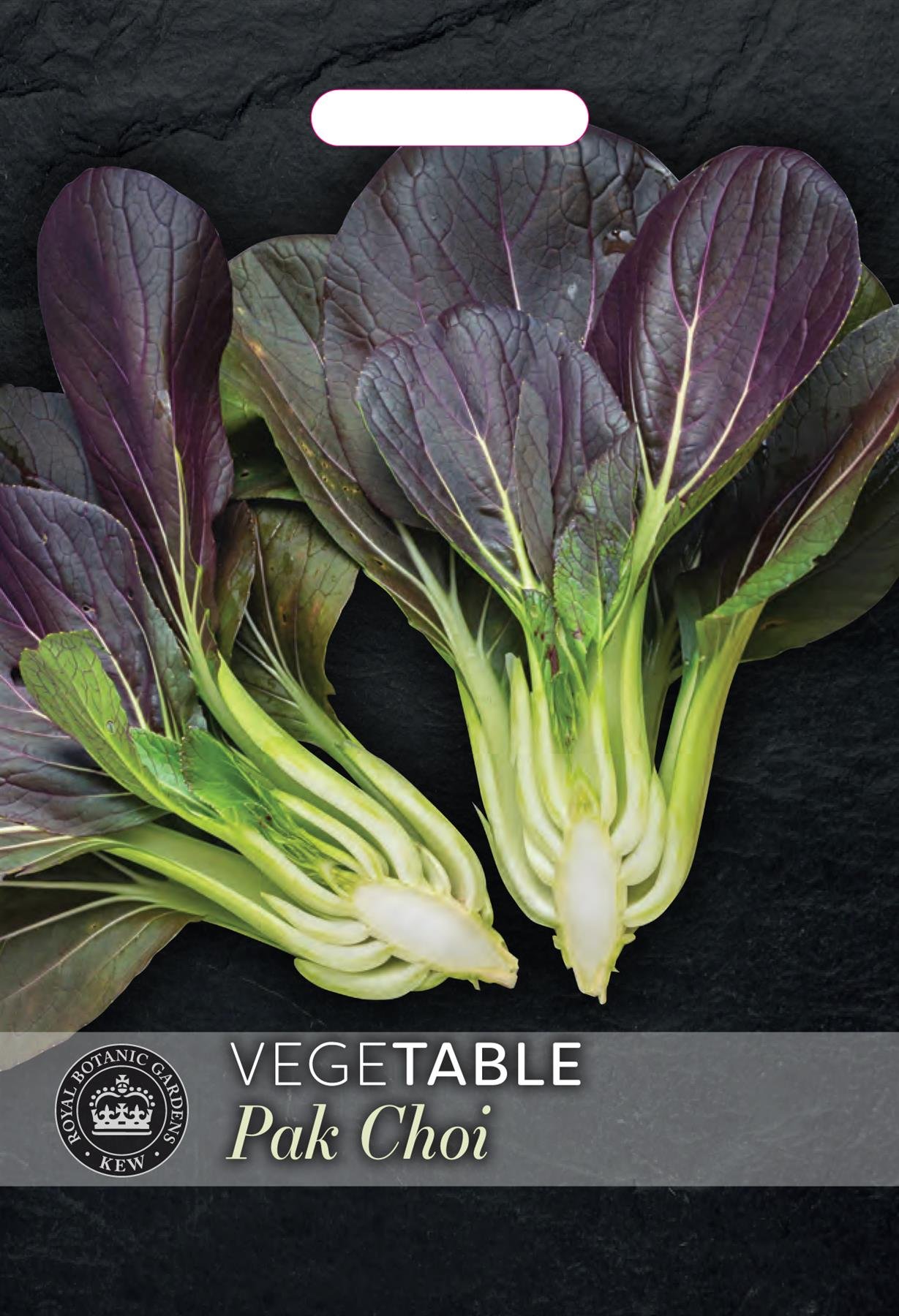 A striking reddish-purple top leaf stands out against the green undersides and vibrant green stems of Pak Choi, making it an ideal choice for adding visual interest to salads and stir fries.