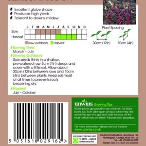 It has an excellent globe shape with a refined tap root and has very healthy erect foliage with partial resistance to downy mildew. It is extremely sweet with the highest sugar content of any commercial beetroot. |