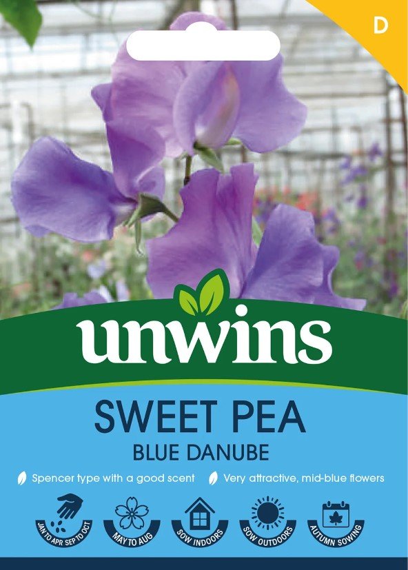 Unwins Sweet Pea Blue Danube Seeds produce spencer-type flowers with an attractive mid-blue hue and a delightful fragrance.